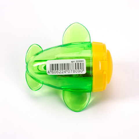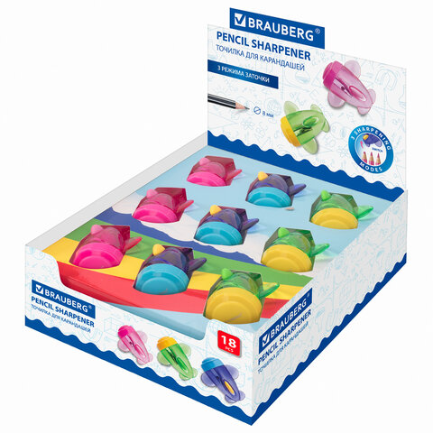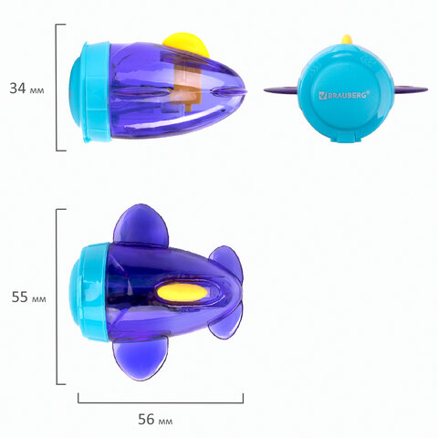 Точилка BRAUBERG "Jet" - предмет №1 в паре с карандашом на рабочем столе в офисе, на школьной парте или дома.<br><br>Эргономичный корпус в форме самолета выполнен из пластика ярких цветов ассорти. Острое стальное лезвие обеспечивает быструю и легкую заточку. Точилка оснащена переключателем режимов заточки, один для чернографитных, другой для цветных карандашей. Карандаши затачиваются аккуратно, а опилки остаются в специальном контейнере. Размер - 34х56х55 мм.<br><br>Количество в комплекте: 1 шт.<br>Материал корпуса: пластик<br>Форма корпуса: фигурная<br>Количество отверстий: 1<br>Контейнер для стружки: да<br>Серия: Jet<br>Шторка для закрытия отверстий: да<br>Цвет: ассорти<br>Высота: 34 мм<br>Ширина: 56 мм<br>Глубина: 55 мм<br>Упаковка : дисплей