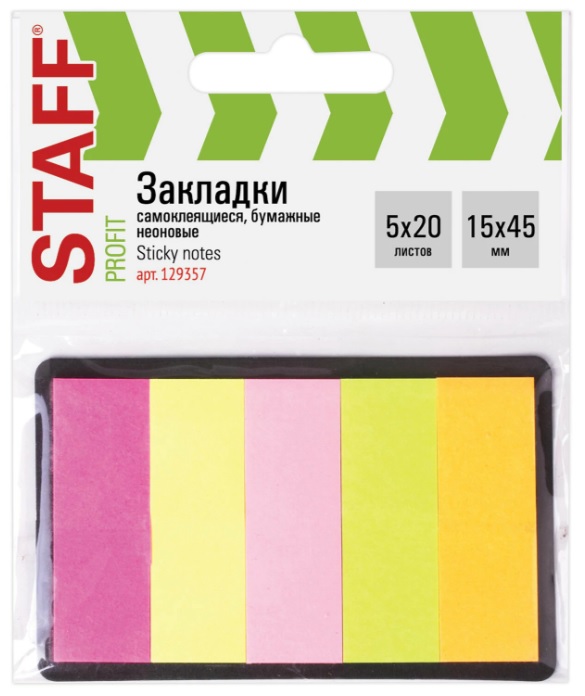----Закладки клейкие STAFF НЕОН. бум. 45х15мм, 5 цветов х 20 листов,на карт. осн.,129357