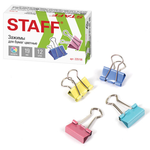 ----Зажимы для бумаг STAFF "Profit", КОМПЛЕКТ 12 шт., 19 мм, на 60 листов, цветные, картонная коробка, 225156