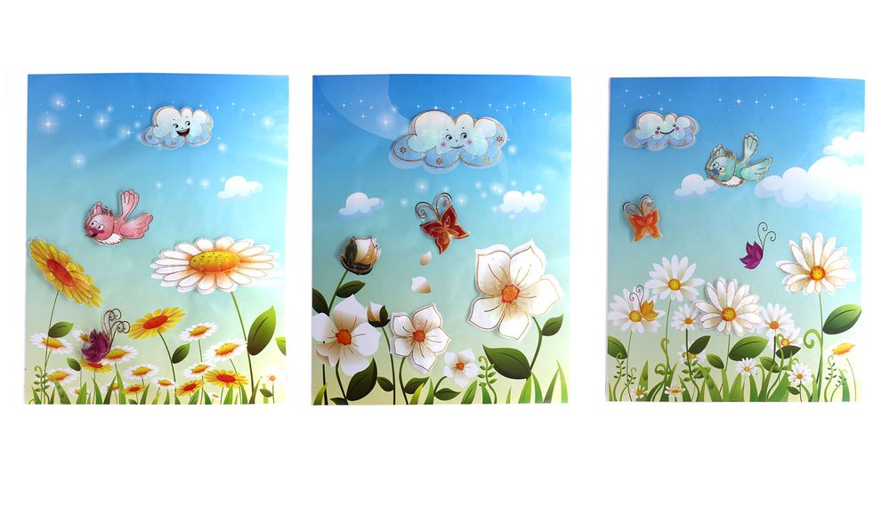 Яркая, красочная наклейка для декорирования. В комплекте несколько изделий, которые составляют единую композицию. Изготавливаются из картона с последующим нанесение цветного пластика. Фактурности придает послойное нанесение рисунка. Особый эффект создает голографическое тиснение по краям. В упаковке 12 штук наклеек.