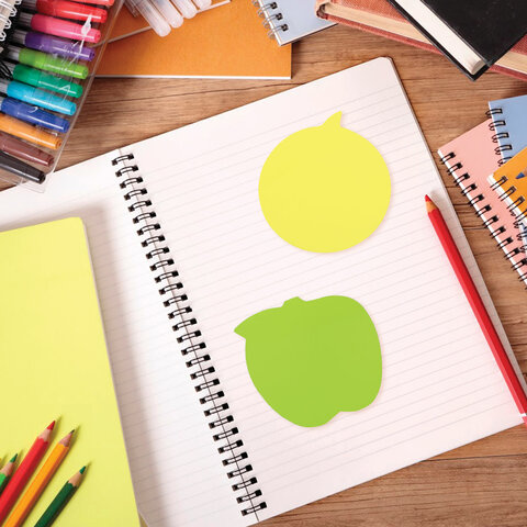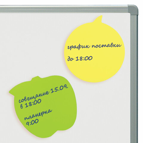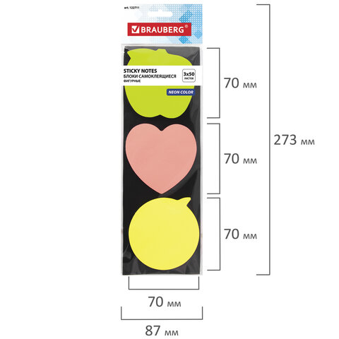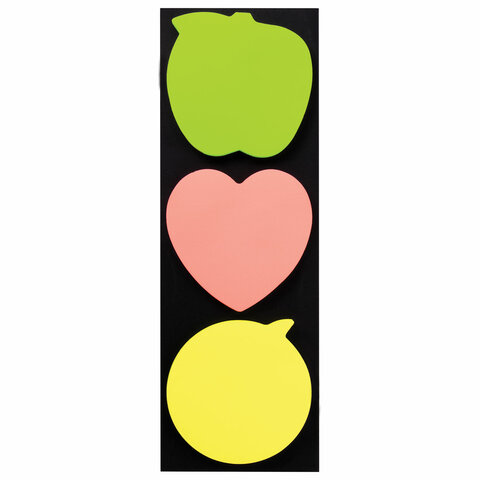 Бумага для заметок с клейким краем BRAUBERG рекомендуется для использования в процессе совещаний, обучения, мозговых штурмов. Идеально подойдет для работников офиса и руководителей.<br><br>Набор из 3 фигурных стикеров неоновых цветов (желтый, розовый, зеленый) в форме яблока, лимона, сердца 70х70 мм состоит из 3 блоков по 50 листов. Плотность бумаги составляет 75 г/м2. Клейкий слой - 35 Н/м. Легко клеятся к любой поверхности. Не оставляют следов. Упакованы в полиэтиленовый пакет с европодвесом.