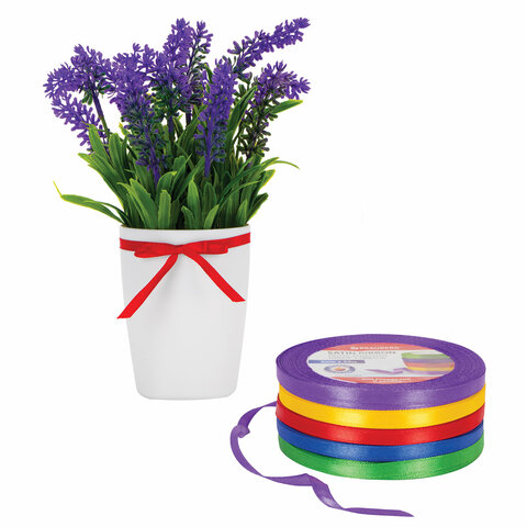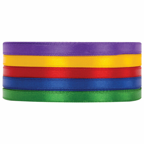 Атласная лента является универсальным текстильным изделием, что обусловлено широкой сферой ее использования. Набор лент атласных BRAUBERG предназначен для оформления подарков, рукоделия, декора, а также используется во флористике для оформления букетов.<br><br>Изделие представляет собой набор из атласных лент ярких оттенков, изготовленных из 100% полиэстера, с ткаными кромками на обоих краях. Кромка на краях лент выполнена с применением полиэстеровой нити. Ленты изготовлены с применением саржевого способа переплетения нитей. В набор входит 5 лент красного, зеленого, желтого, синего и фиолетового цветов шириной 6 мм (± 3%) и длиной 23 м, каждая из которых намотана на втулку из пенополистирола. Набор лент упакован в термоусадочную пленку, содержащую этикетку с краткой информацией о товаре.<br><br>Ширина ленты: 6 мм<br>Длина: 23 м<br>Количество в комплекте: 5 шт.<br>Количество цветов: 5<br>Цвет: разноцветный<br>Материал: полиэстер<br>Особенности: интенсив
