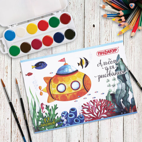 Альбом для рисования ПИФАГОР предназначен для детей дошкольного и младшего школьного возраста. Яркая, красочная обложка.<br><br>Содержит 12 листов плотностью 100 г/м2 формата А4 (203х288 мм). Красочная обложка выполнена из офсетной бумаги. Скрепление листов осуществляется с помощью скрепки. Подходит для смешанных техник рисования: красками, карандашами и фломастерами.