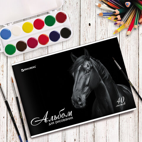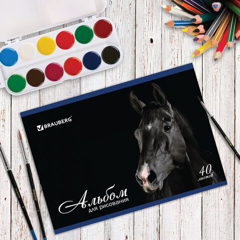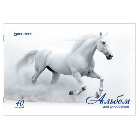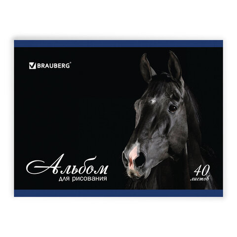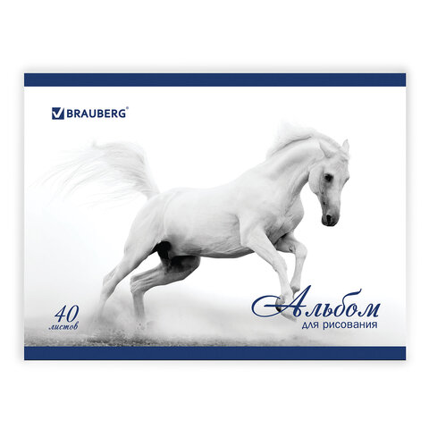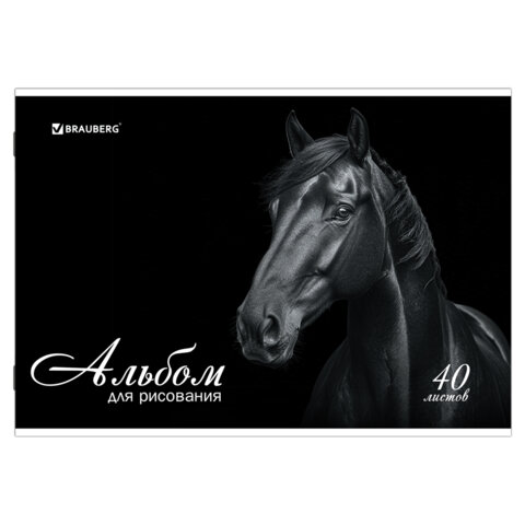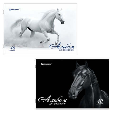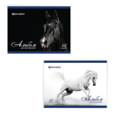 ----Альбом для рисования, А4, 40 листов, скоба, обложка картон, BRAUBERG, 200х283 мм, "Благородные кони" (2 вида), 103728