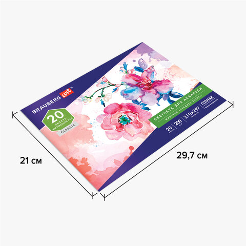 Альбом для рисования BRAUBERG ART предназначен для профессионалов и людей, увлекающихся живописью. В альбоме использована специальная бумага для рисования акварелью производства ГОЗНАК СПб.<br><br>Содержит 20 листов плотностью 200 г/м2 формата А4 (210х297 мм). Красочная обложка выполнена из мелованного картона. Скрепление листов осуществляется с помощью склейки. Подходит для смешанных техник рисования: красками, карандашами и фломастерами.<br><br>Формат: А4<br>Серия: Classic<br>Плотность внутреннего блока: 200 г/м2<br>Тип товара: альбомы для акварели<br>Количество листов: 20<br>Внутренний блок: художественная бумага для акварели ГОЗНАК<br>Ширина: 210 мм<br>Длина: 297 мм<br>Текстура: среднее зерно<br>Цвет внутреннего блока: белый<br>Белизна 100%: да<br>Без кислот: да<br>Обложка: мелованный картон<br>Тип скрепления: склейка<br>Жесткая подложка: да<br>Дизайн обложки: Прекрасные цветы<br>Количество дизайнов в упаковке: 1 шт.<br>Индивидуальная упаковка: да