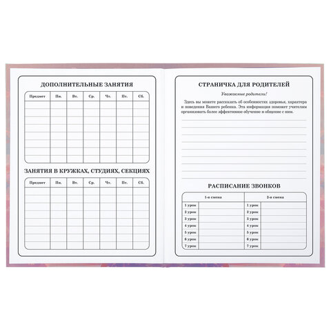 • Школьный дневник ЮНЛАНДИЯ выполняет функции журнала регистрации оценок и домашних заданий, полученных на уроках, замечаний по поведению и прилежанию, служит средством общения учителей и родителей и показателем успеваемости ученика.<br><br>Предназначен для учащихся начальных классов. Интегральный переплет заметно уменьшает вес дневника, сохраняя все преимущества жесткой обложки. Спецэффект "матовая ламинация с выборочным лаком" придает глубину изображению, не позволяет образовываться бликам на изделии. Внутренний блок содержит 48 листов и состоит из офсетной белой бумаги плотностью 60 г/м2. В справочном материале собраны основные подсказки для учащихся.<br><br>Тип изделия: дневник с выборочным лаком<br>Тип обложки: гибкая обложка<br>Тип спецэффектов на обложке: выборочный лак, матовая ламинация<br>Основной цвет обложки: с дизайном<br>Серия: Print<br>Дизайн: FairyTale<br>Пол ребенка: девочка<br>Внутренний блок: офсет<br>Плотность внутреннего блока: 60 г/м2<br>Цвет внутреннего блока: белый<br>Справочный материал: да