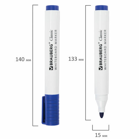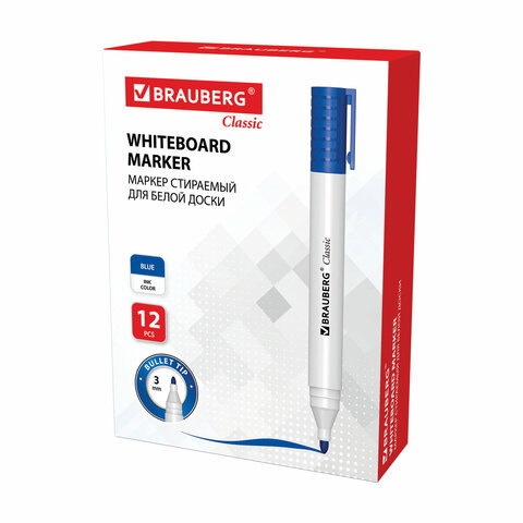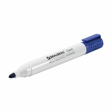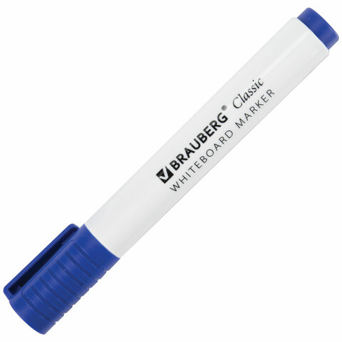 Высококачественный маркер BRAUBERG "CLASSIC" для белой доски. Предназначен для письма на досках с магнитно-маркерной поверхностью.<br><br>Маркер для доски синего цвета обладает круглым пластиковым корпусом диаметром 15 мм. Наконечник круглой формы обеспечивает толщину линии письма 3 мм, что позволяет писать крупным шрифтом, который будет хорошо виден. Основа чернил - спиртовая. Чернила быстро высыхают и не оставляют разводов, легко стираются сухой губкой. Изделие не перезаправляется. Цвет колпачка с клипом соответствует цвету чернил.<br><br>Цвет: синий<br>Серия: CLASSIC<br>Толщина линии письма: 1, 1,5, 2, 2,5, 3<br>Наконечник: круглый<br>Количество в комплекте: 1 шт.<br>Основа чернил: спиртовая<br>Чернила стираются сухой губкой: да<br>Не протекает при перепаде давления: да<br>Наличие клипа на колпачке: да<br>Материал корпуса: пластик