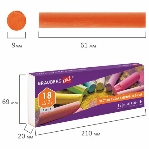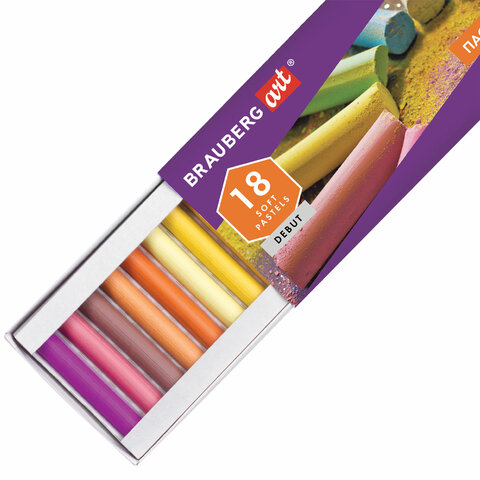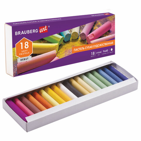Сухая художественная пастель BRAUBERG ART "Debut" предназначена для графики и живописи. Прекрасно подойдет как для начинающих художников и любителей изобразительного искусства, так и профессионалов.<br><br>Легко ложится на различные фактуры цветной бумаги, бумагу для рисования, холст, картон, дерево, керамику. Также можно наносить на влажную поверхность или размывать водой для достижения акварельного эффекта. 18 цветов позволяют полностью передать палитру цветов. Высокое качество пигментов и связующего обеспечивает низкий расход материала, хорошую укрывистость и яркость цвета. Пастель имеет вид брусков с круглым сечением. Не токсична и безопасна при использовании. При попадании на одежду или кожу рук легко смывается тёплой водой. Благодаря компактной упаковке удобно брать с собой.