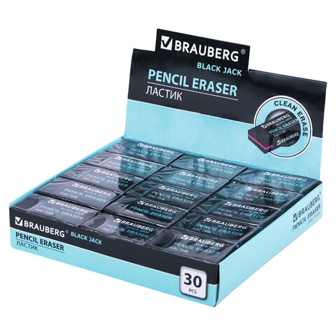 • Ластик BRAUBERG "Black Jack" предназначен для удаления надписей, сделанных чернографитными карандашами.<br><br>Трехслойный ластик прямоугольной формы в картонном держателе, который защищает поверхность от загрязнения и обеспечивает удобство использования. Представлен в черном цвете с промежуточным красным слоем. Размер – 40х20х11 мм. Поставляется в картонном дисплее.<br><br>Количество в упаковке: 1 шт.<br>Материал: термопластичная резина<br>Форма: прямоугольная<br>Стираемые письменные принадлежности: чернографитные карандаши<br>Держатель: картонный<br>Цвет: черный<br>Серия: Black Jack<br>Не оставляет бумажной пыли: да<br>Размер: 40х20х11 мм<br>Индивидуальная упаковка: да<br>Упаковка: дисплей