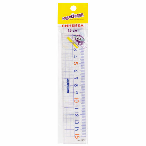 ----Линейка пластик 15 см ЮНЛАНДИЯ "ШКОЛЬНАЯ", прозрачная, европодвес, 210734