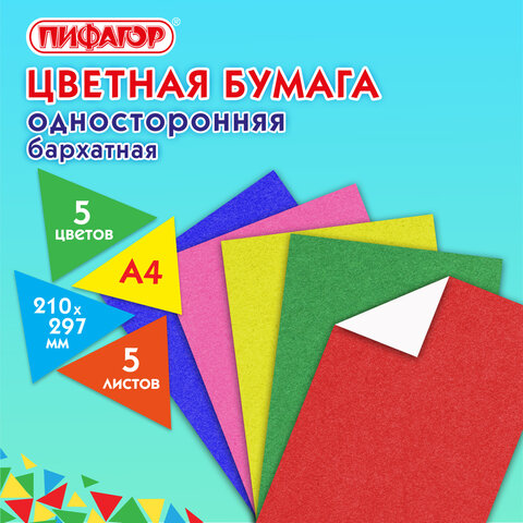 ----Цветная бумага А4 БАРХАТНАЯ, 5 листов 5 цветов, 110 г/м2, ПИФАГОР, 128971