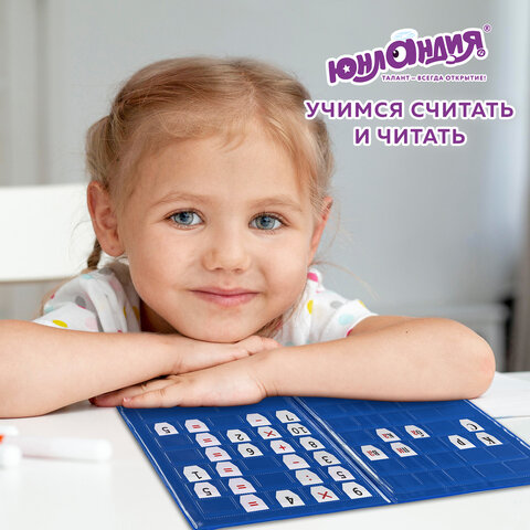 Касса букв, цифр и счёта ЮНЛАНДИЯ - отличное наглядное пособие для обучения чтению и счету в дошкольном образовании и начальных классах. Благодаря пособию ребенок научится читать, считать и решать простые арифметические задачи.<br><br>Касса содержит 8 бумажных карточек формата А5 с напечатанными на них буквами, цифрами, математическими знаками, которые предварительно нужно вырезать для дальнейшего использования. Вырезанные элементы удобно размещаются и хранятся в папке из ПВХ со специальными прорезями и прозрачными карманами. Максимальная высота символа – 23 мм. Предназначен для детей старше 3 лет.