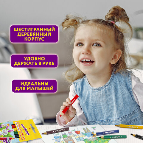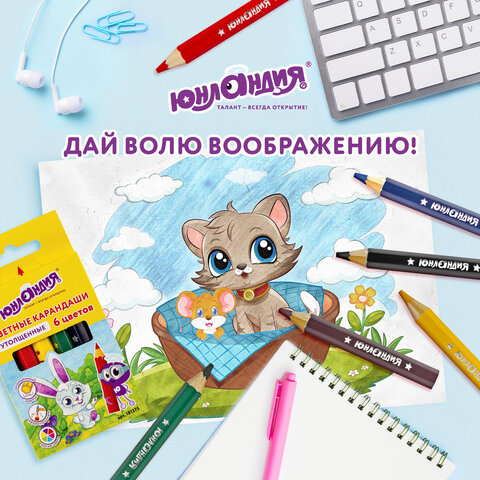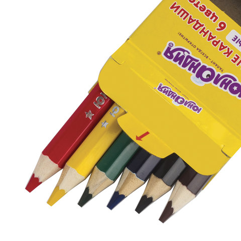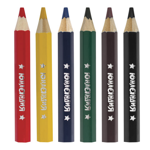 ----Карандаши цветные утолщенные ЮНЛАНДИЯ "МАЛЫШИ-КАРАНДАШИ", 6 цветов, укороченные, шестигранные, грифель 5 мм, натуральное дерево, 181375