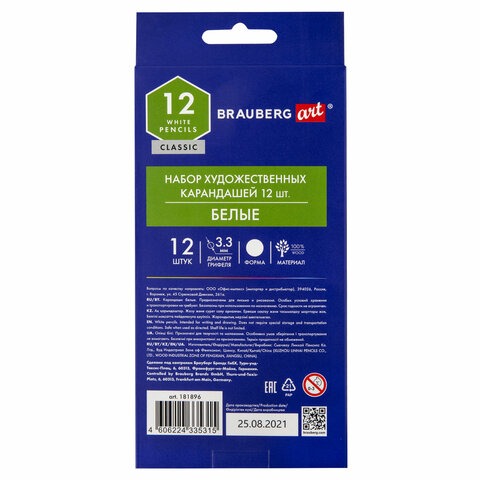 Белые карандаши BRAUBERG ART "CLASSIC" обеспечивают гладкое письмо благодаря мягкому грифелю диаметром 3,3 мм.<br><br>Набор карандашей белого цвета. Карандаши изготовлены из дерева высокого качества. Имеют круглое сечение и матовый корпус. Обладают длиной 175 мм, легко точатся и не крошатся. Мягкий грифель. Диаметр грифеля - 3,3 мм. Поставляются заточенными.<br><br>Количество в комплекте: 12 шт.<br>Серия: Classic White Pencil<br>Количество цветов: 1<br>Тип грифеля: мягкий<br>Диаметр грифеля: 3.3 мм<br>Диаметр корпуса: 7.1 мм<br>Особенности: ударопрочный грифель<br>Заточенные: да<br>Форма корпуса: круглая<br>Материал корпуса: высокосортная древесина<br>Упаковка: картонная упаковка с европодвесом