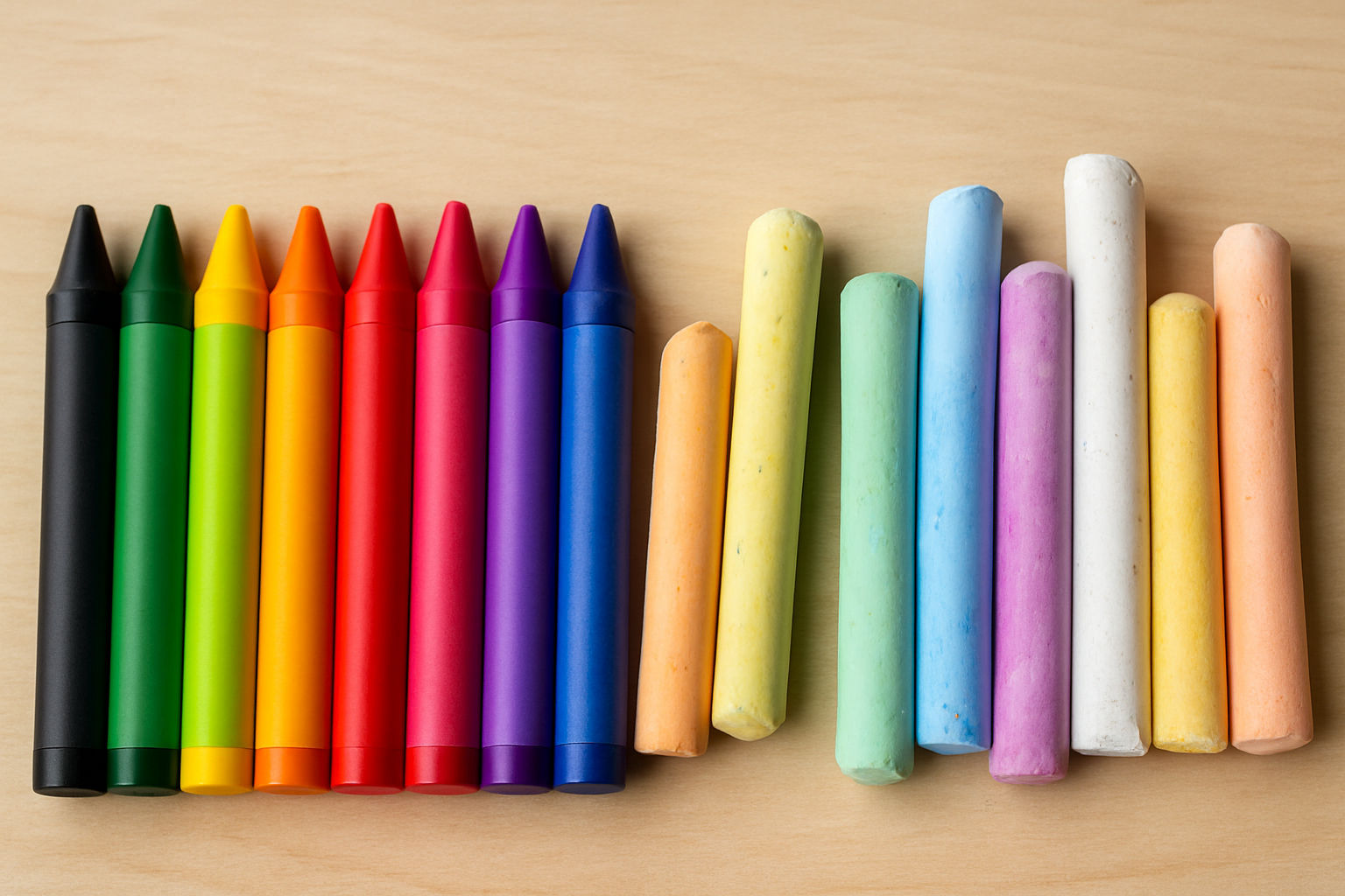 Когда встает вопрос, чем рисовать ребёнку - мелками, фломастерами или карандашами - родители часто выбирают мелки: они яркие, мягкие, не требуют заточки и вроде бы безопаснее. Но тут же возникает следующий: какие именно мелки выбрать - классические или восковые? Они выглядят похоже, но на деле - это два разных мира. В этой статье мы разберёмся, чем отличаются восковые и обычные цветные мелки, в чём их плюсы и минусы, с какого возраста подходят, где использовать удобнее - и какие мелки лучше купить для дома, детского сада или начальной школы.